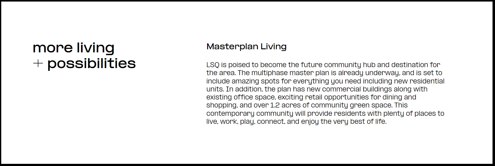 Picture your life without borders with LSQ’s central location. LSQ offers that city feel while having more space, more parks, more accessibility than you can imagine. It’s the best of both worlds.