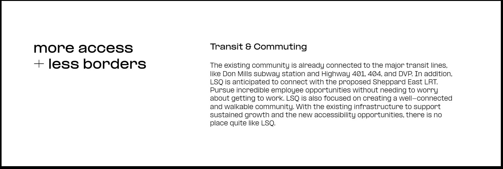 Welcome to LSQ, our vision for everything a community should be. Centrally located, bringing together residents, families, business owners, people who work in the neighbourhood and anyone passing through, in one space that accommodates everyone’s needs. It’s going to be an anchor in the Sheppard East community.